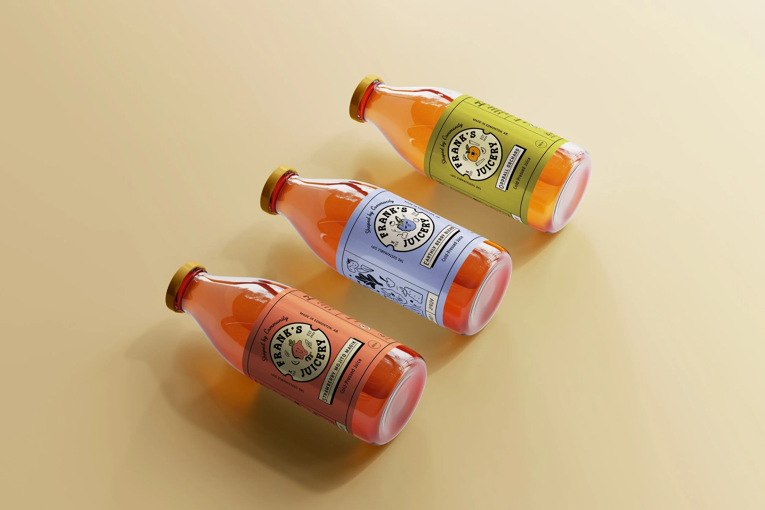 2024 - Brand Identity for Frank's Juicery. A business that takes misshapen produce from local farms and neighbours backyards, and turns it into delicious juice.